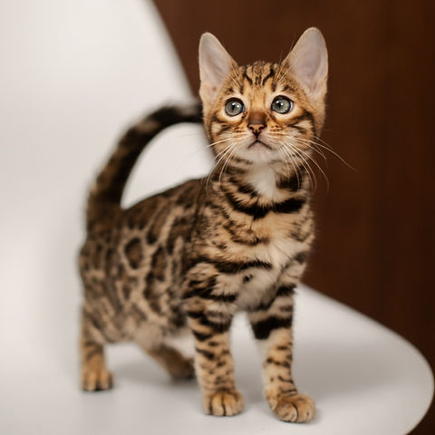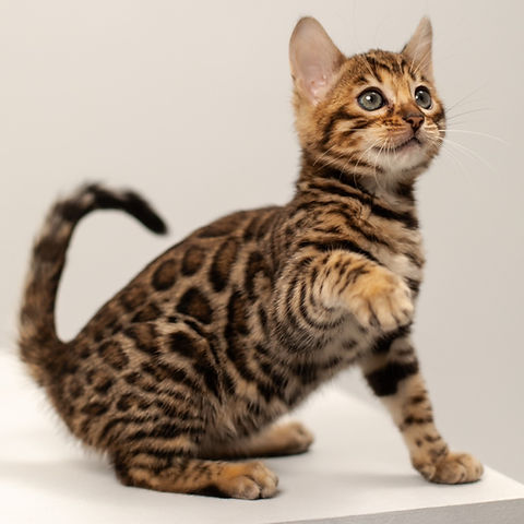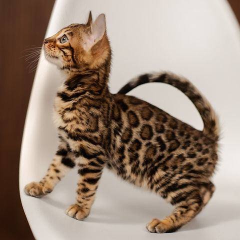 Radiant and full of charm, Bella is a gorgeous female Bengal kitten with a warm brown gold spotted coat. Her golden base is beautifully contrasted by bold, well-defined spots, giving her the exotic, wild-inspired appearance that makes Bengals so admired. With her sleek, athletic frame and expressive eyes, Bella carries herself with natural elegance and playful energy.